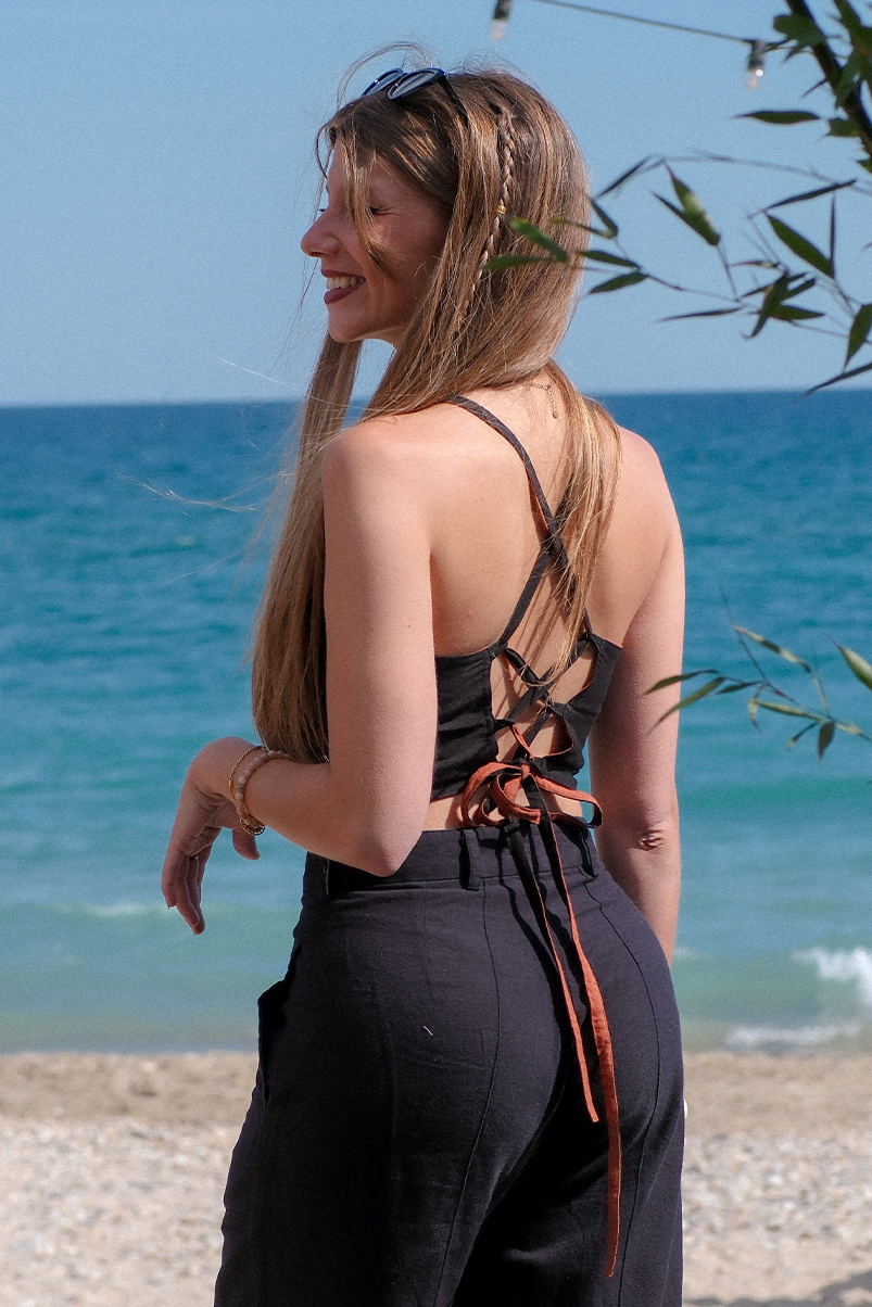 - Dos : laçage croisé en ruban de coton, maintien réglable
